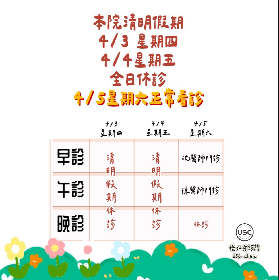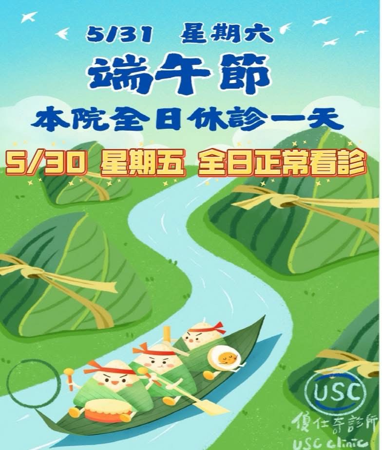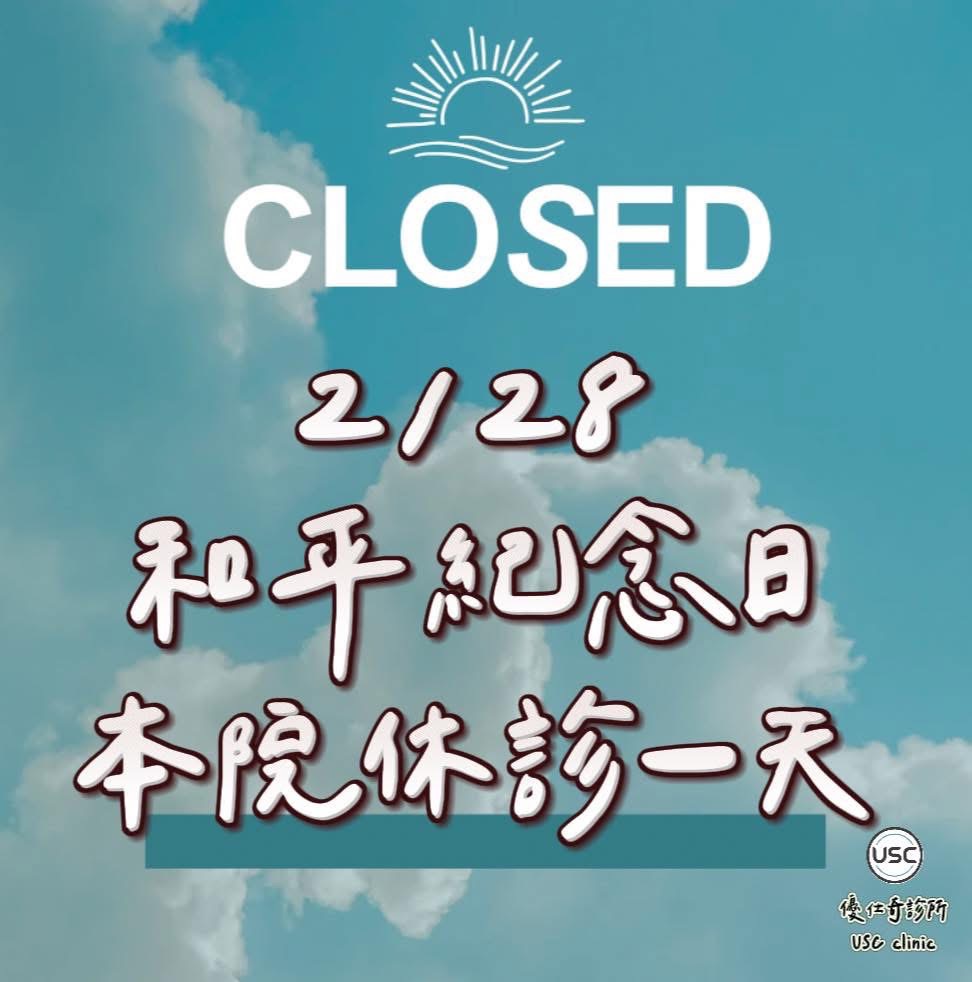 26 5 月 端午節休診公告 5/31 端午節 本院休診一天 Continue reading 01 4 月 清明節休診公告 4/3-4/4清明節 本院休診兩天 Continue reading 25 2 月 228休診公告 2/28和平紀念日 本院休診一天 Continue reading 23 1 月 春節休診公告 1/27-2/2本院春節休診 Continue reading 27 12 月 休診公告 1/1本院全日休診一天 Continue reading 05 12 月 門診異動公告 12/17-12/20 陳威佑醫師門診由張奇男醫師及沈士權醫師代診! Continue reading