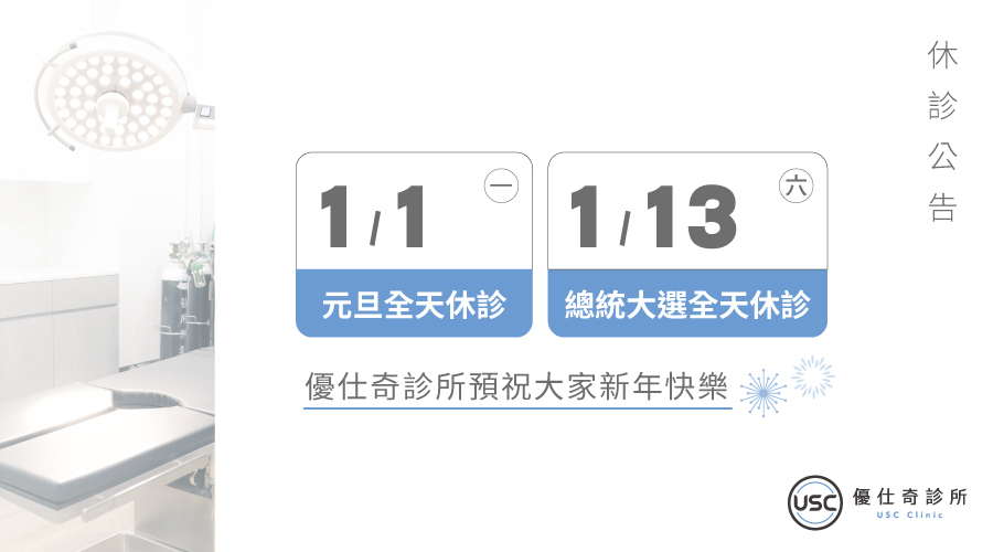 優仕奇診所感謝各位的支持與信任,為了提供更好的服務,我們特別宣布以下公告:本診所將於1月1日(星期一)及1月13日(星期六)全天休診,不便之處敬請見諒。